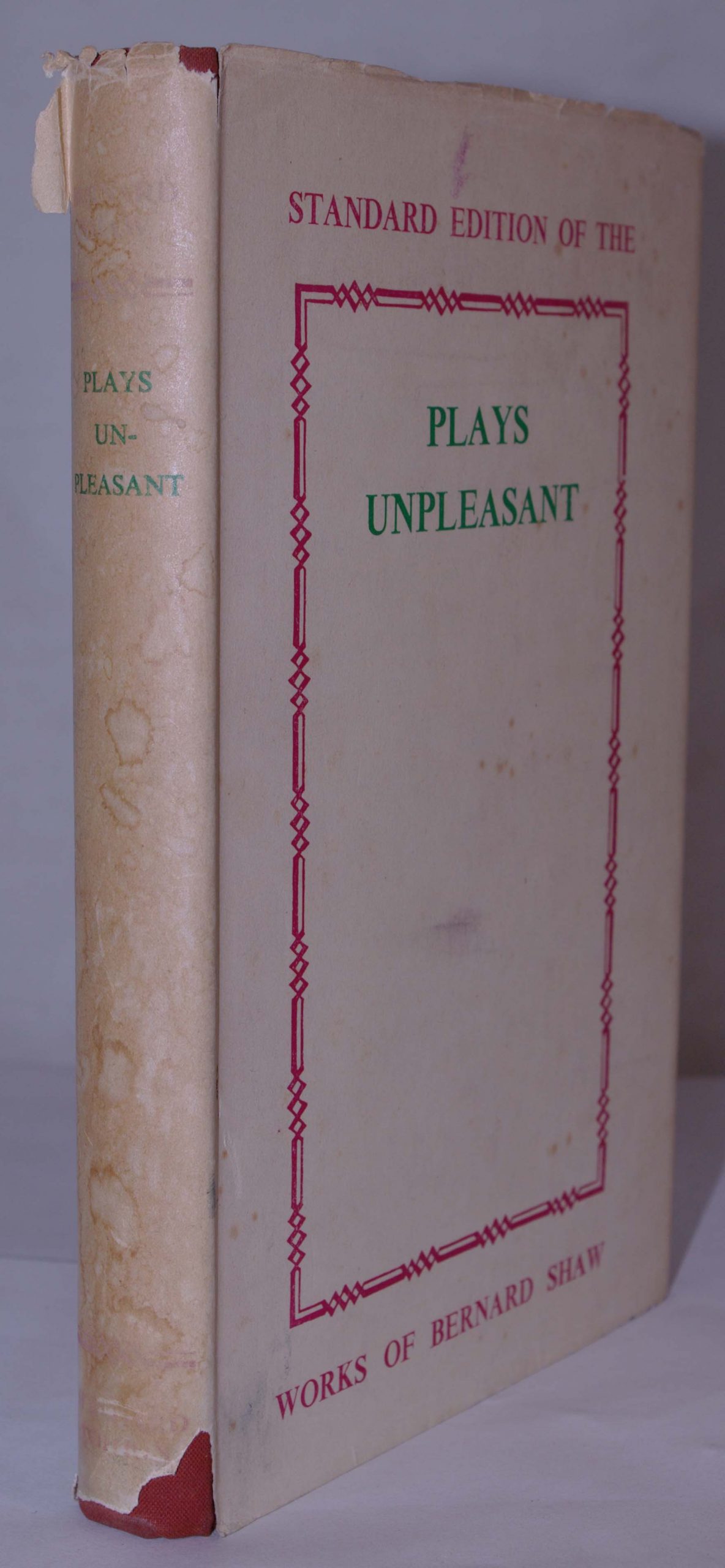 The First Volume Containing Three Unpleasant Plays: Widowers’ Houses, The Philanderer and Mrs Warren’s Profession. Good 1952 Edition – some shelf wear, staining to the spine of the dust wrapper, small tears and and bits missing, prize plate on inside of cover, light foxing to the ffep and rfep, contents clean, bright and tight.